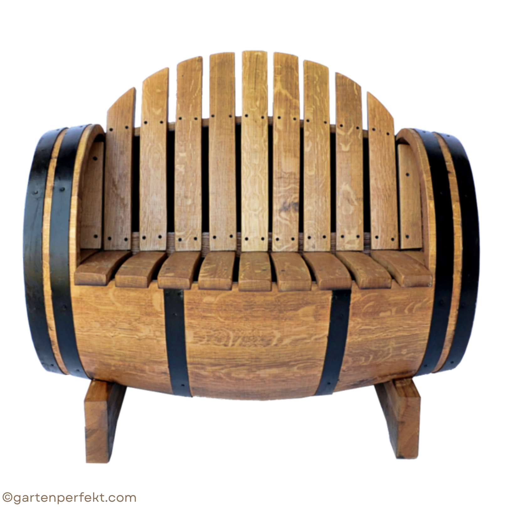 Der charakteristische Look mit schwarzlackierten Fassringen macht den Sessel aus Weinfass zu einem sofort aufstellbaren Highlight für Terrasse, Vinothek oder Wohnzimmer.