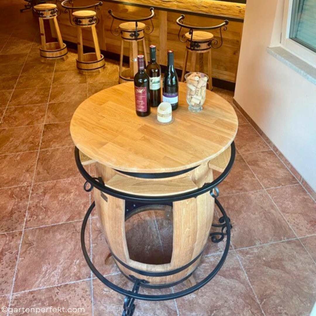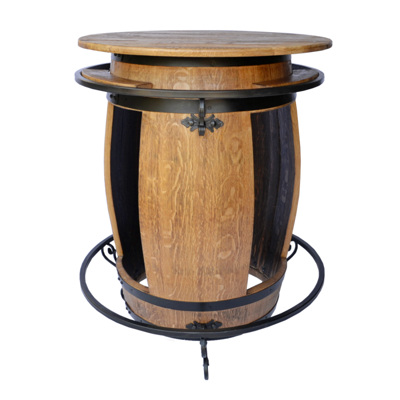 Fasstisch GRACIANO Stehtisch vom Fass. Die Serie GRCIANO wird mit handgeschmiedeten Zierelementen geschmückt.