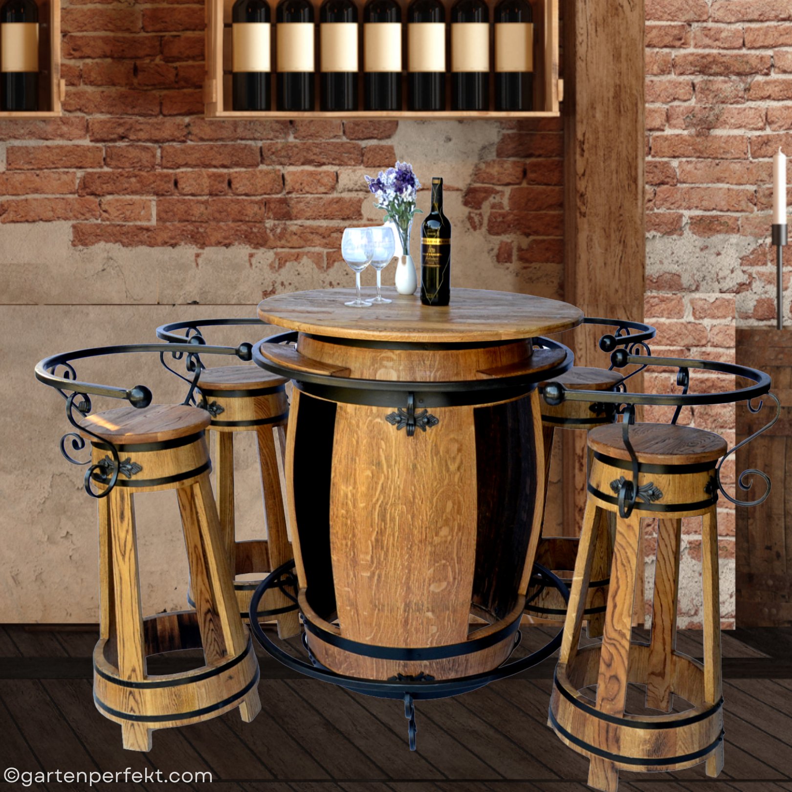 Die Sitzgarnitur vom Fass Graciano kombiniert einen hohen Fasstisch (Ø 80 cm, H 103 cm) mit vier passenden Hockern – perfekt für stilvolle Genussmomente.